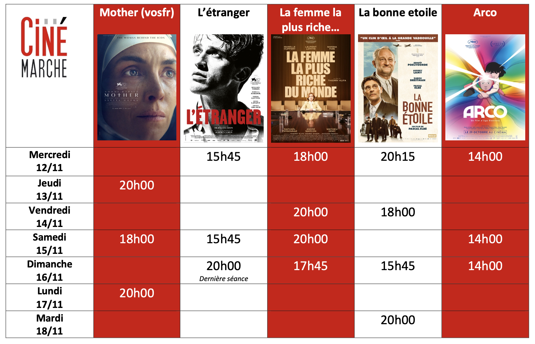 Programme des films proposés par l’asbl Cinémarche au CineXtra de Marche du 12 au 18/11 inclus